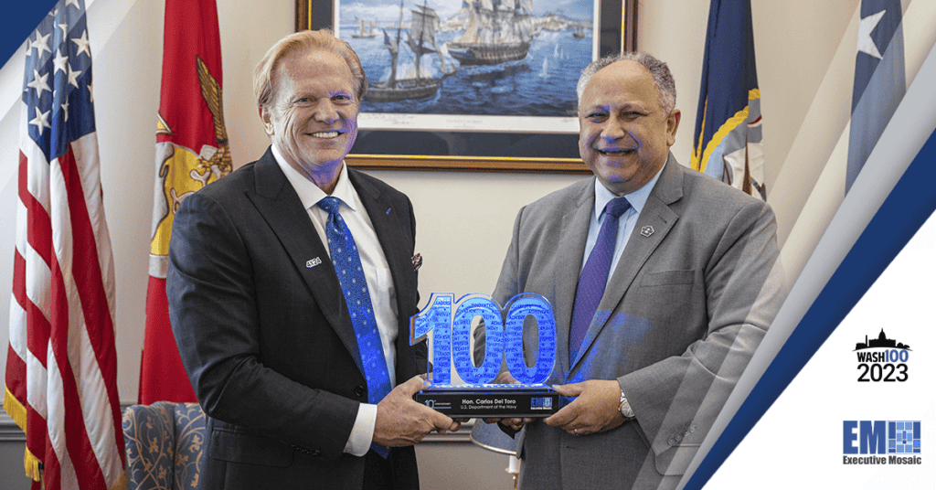 U.S. Navy Secretary Carlos Del Toro accepted his 2023 Wash100 Award during a recent meeting with Jim Garrettson, CEO of Executive Mosaic and founder of the elite recognition. Wash100 reached its 10th anniversary this year, a reflection of its enduring legacy as the government contracting industry’s highest honor. In each iteration of the competition, Wash100 puts its nominees […]