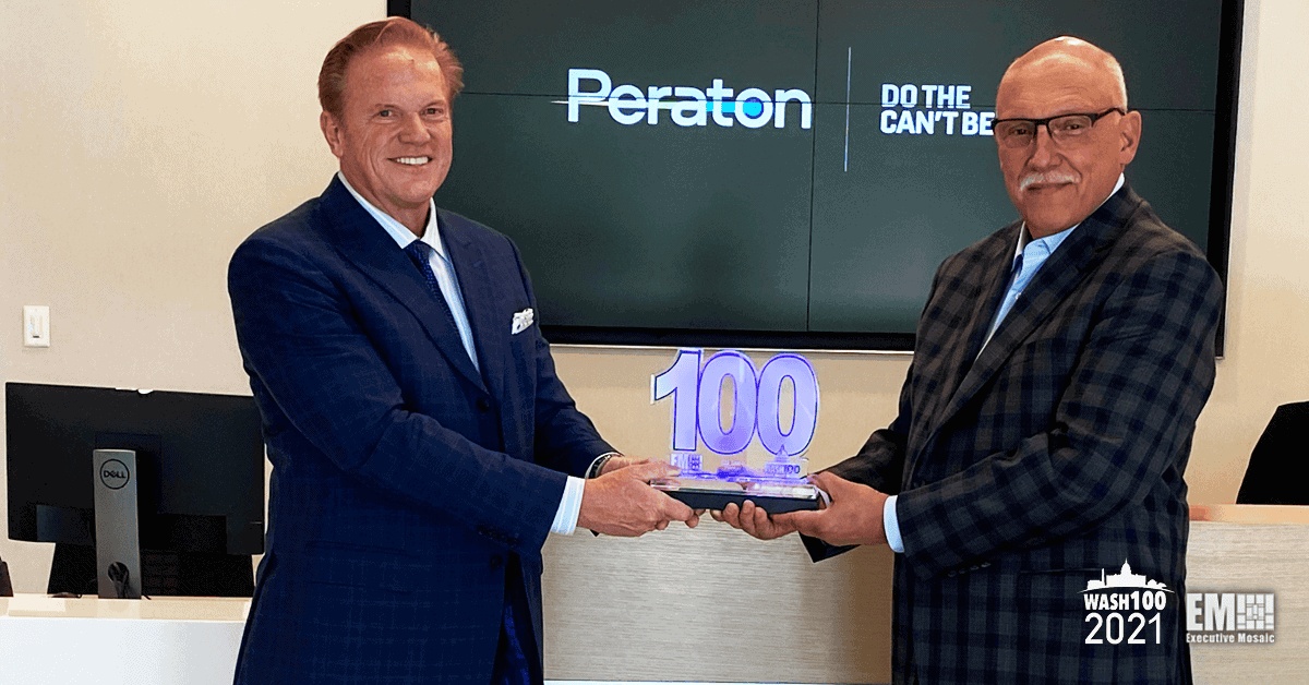 Executive Mosaic CEO Jim Garrettson presented the fifth overall Wash100 Award, the most prestigious and sought-after award in all of government contracting (GovCon), to Stu Shea, chairman, president and CEO of Peraton, during a recent visit to the company's office.
