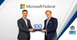 Wes Anderson, vice president of defense at Microsoft, was presented with his 2023 Wash100 Award by Executive Mosaic CEO Jim Garrettson during a recent visit to Microsoft
