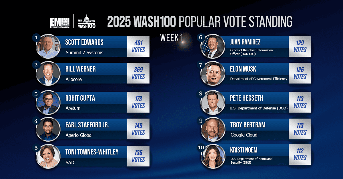 Executive Mosaic, the Capital region’s premier government contracting events and media organization, was excited to roll out its 2025 class of Wash100 Award winners. (The list compiles the most promising and impactful executives on both the public and private sector sides of GovCon.) But the company was arguably even more ecstatic to begin its yearly popular vote competition for the award. This nail-biter of a race allows the public to cast 10 votes apiece for their favorite of this year’s recipients. It begins in late January and runs through late April, before the winner is announced in May.