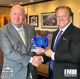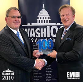 Jim Garrettson, founder and CEO of Executive Mosaic, presented Ken Asbury, chief executive officer and president of CACI International, with his sixth consecutive Wash100 Award on Wednesday. Asbury is the only active 2019 Wash100 recipient to have received the award...