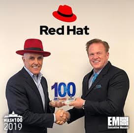 Jim Garrettson, founder and CEO of Executive Mosaic, presented Paul Smith, senior vice president and general manager of Red Hat’s Public Sector, with his third Wash100 Award on Wednesday. Executive Mosaic recognizes Smith for accelerating the use of hybrid cloud...