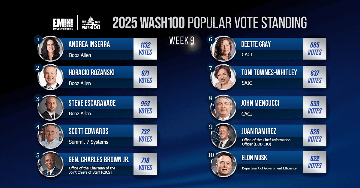 The Wash100 Popular Vote contest has entered its ninth week with familiar names dominating the leaderboard—but not without a few notable shake-ups. Andrea Inserra, Horacio Rozanski, and Steve Escaravage, all of Booz Allen Hamilton, remain locked in the top three spots for the third consecutive week. While their vote counts saw modest increases—Inserra now at 1,132, Rozanski at 971, and Escaravage at 952—the real action this week came just below them.