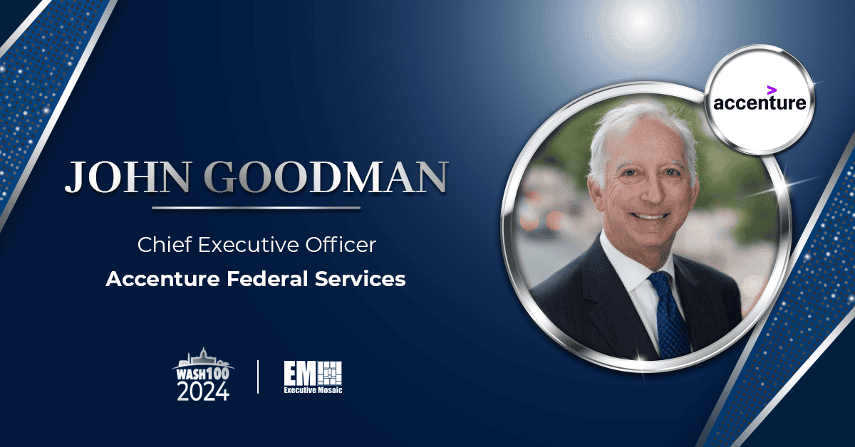 Accenture Federal Services CEO John Goodman is being honored by Executive Mosaic for the seventh time with the 2024 Wash100 Award for his leadership of the company’s initiatives to help government agencies strengthen their information security infrastructure.
