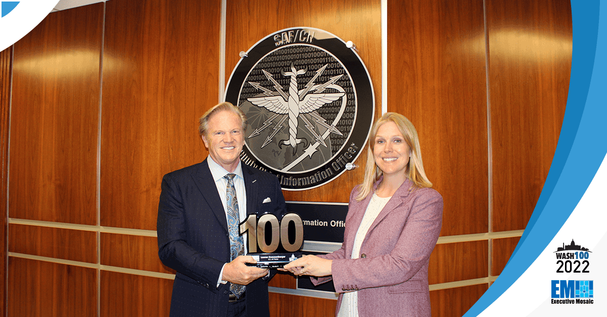 Lauren Knausenberger, chief information officer for the Department of the Air Force, was recently presented her 2022 Wash100 Award by Executive Mosaic CEO Jim Garrettson during a visit to the Air Force’s office within the Pentagon in Washington D.C.