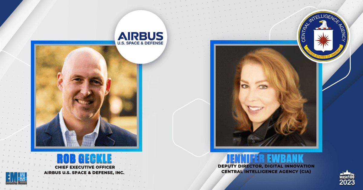 On Friday, Executive Mosaic spotlighted the achievements of Airbus U.S. Space & Defense CEO Rob Geckle and Central Intelligence Agency Deputy Director for Digital Innovation Jennifer Ewbank, two 2023 Wash100 Award winners.