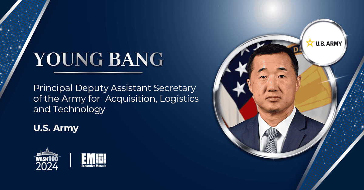 Executive Mosaic has elected Young Bang, U.S. Army principal deputy assistant secretary for acquisition, logistics and technology, as one of its first-time winners of the Wash100 Award for 2024. The recognition underscores how his endorsement of artificial intelligence, automation and digital engineering supported the integration of cutting-edge technologies into the Army of 2030 strategy.