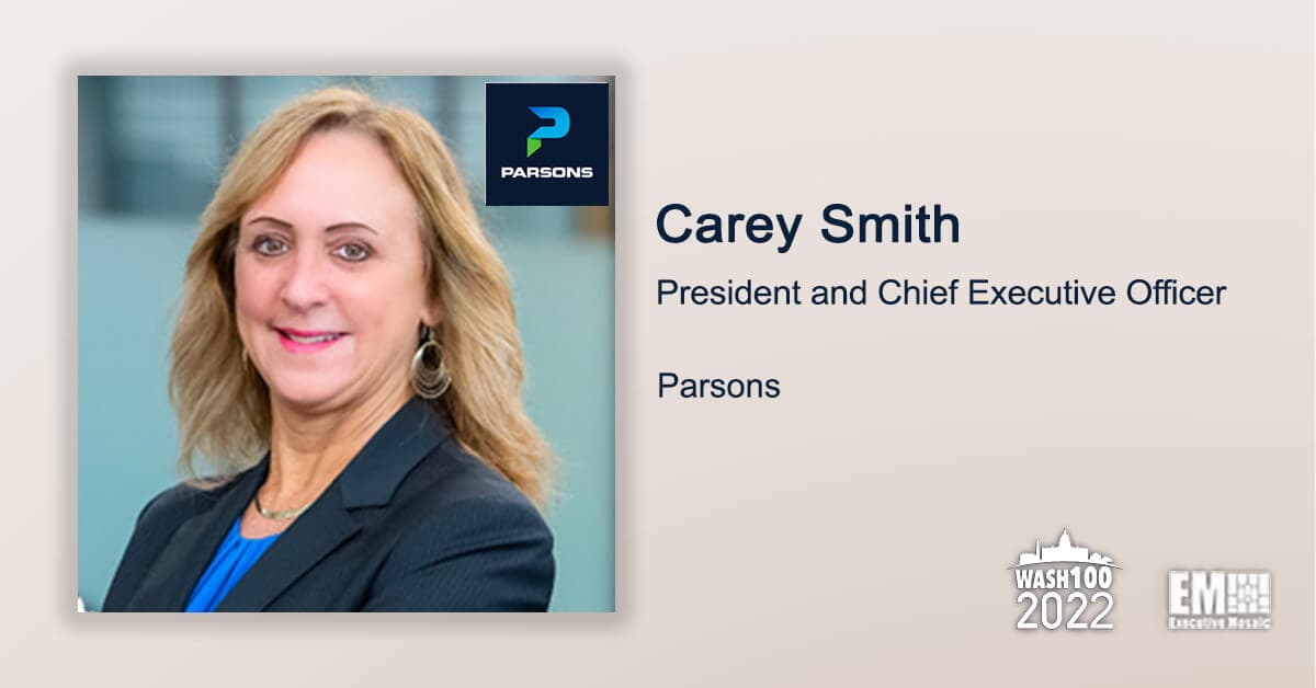 Carey Smith, president, CEO and incoming chairwoman of Parsons, has been recognized by Executive Mosaic in the 2022 edition of the Wash100 Award, the fourth time that she’s received the most prestigious recognition in government contracting.