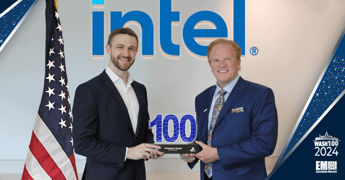 Chris George, the newly minted president and general manager of Intel Federal, accepted his 2024 Wash100 Award from Executive Mosaic CEO Jim Garrettson in a recent in-person meeting at Intel's Fairfax, Virginia office.