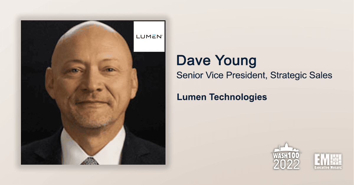 Executive Mosaic is pleased to welcome Dave Young, senior vice president of strategic sales at Lumen Technologies, as an inductee into the 2022 class of the prestigious Wash100 Award, which is annually bestowed upon the top 100 executives of consequence in the government contracting community for their notable impacts and contributions across the federal sector.