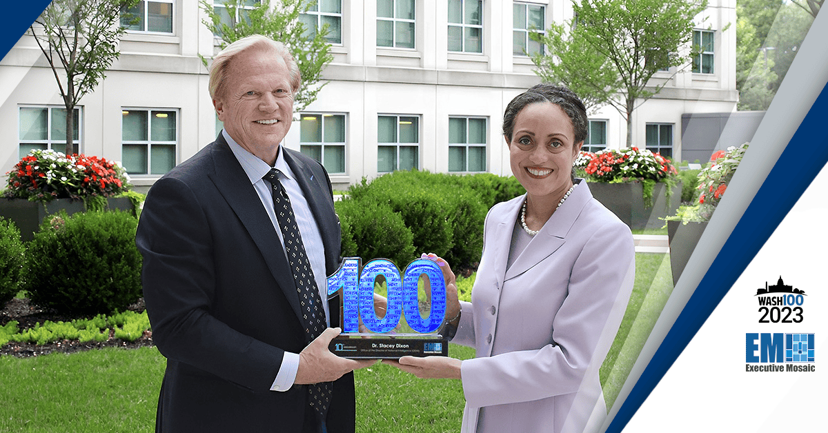 Executive Mosaic CEO Jim Garrettson delivered the 2023 Wash100 Award to Principal Deputy Director of National Intelligence Dr. Stacey Dixon during a recent visit to the Office of the Director of National Intelligence headquarters.