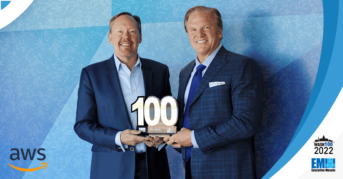 During a recent visit to Amazon Web Services (AWS) office, Executive Mosaic CEO Jim Garrettson presented the first Wash100 Award, the most coveted and acclaimed award in all of government contracting (GovCon) to Max Peterson, vice president of AWS’ worldwide public sector business.