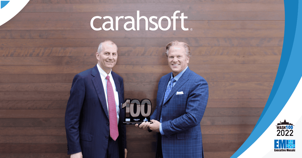 Craig Abod, president of Carahsoft Technology, was presented his 2022 Wash100 Award, the highest honor in all of government contracting (GovCon), by Executive Mosaic CEO Jim Garrettson during a recent visit to the company’s office in Reston, VA.