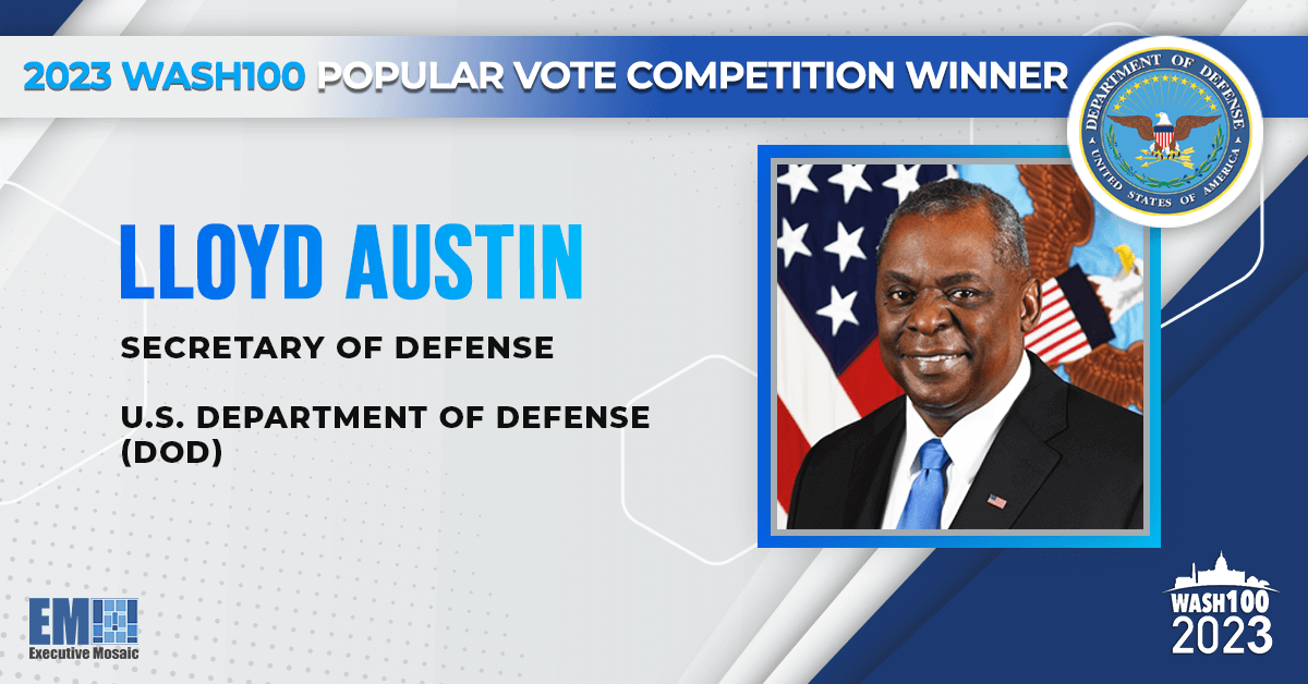 After a competitive four months and tens of thousands of votes, Executive Mosaic is excited to announce that the winner of the 2023 Wash100 popular vote competition is the resolute Department of Defense cornerstone, Defense Secretary Lloyd Austin.
