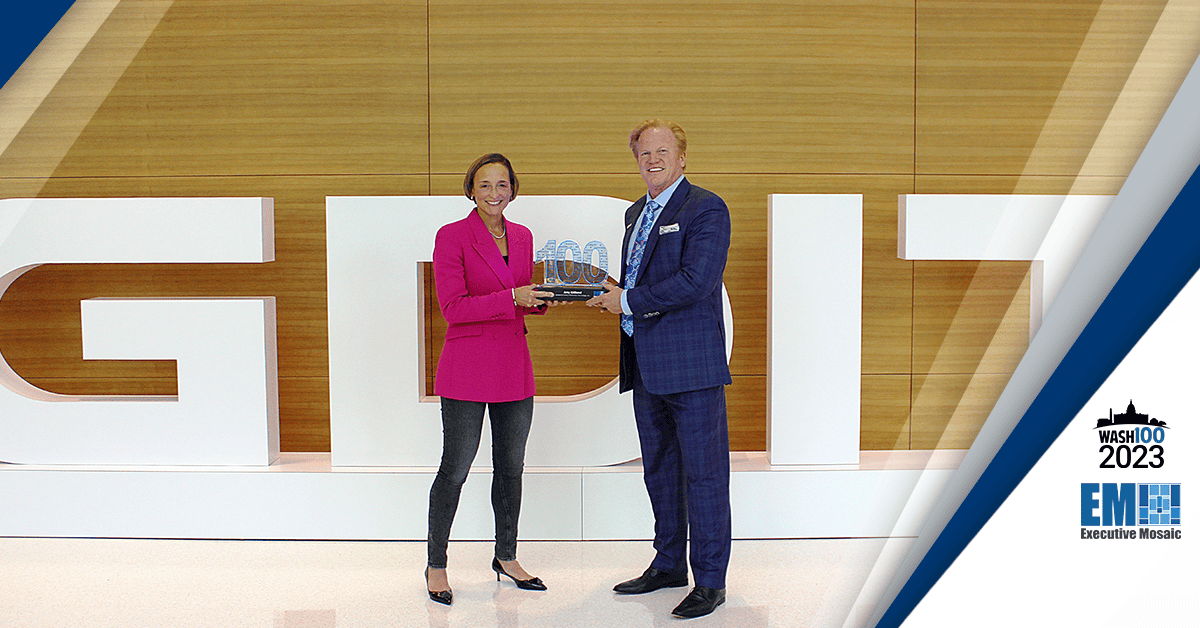 Executive Mosaic CEO Jim Garrettson delivered the 2023 Wash100 Award to Amy Gilliland, president of General Dynamics Information Technology, during his recent visit to the latter's company offices.