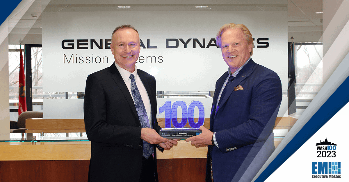 Chris Brady, president of General Dynamics Mission Systems, received his 2023 Wash100 Award in Executive Mosaic CEO Jim Garrettson’s recent visit to GDMS offices.