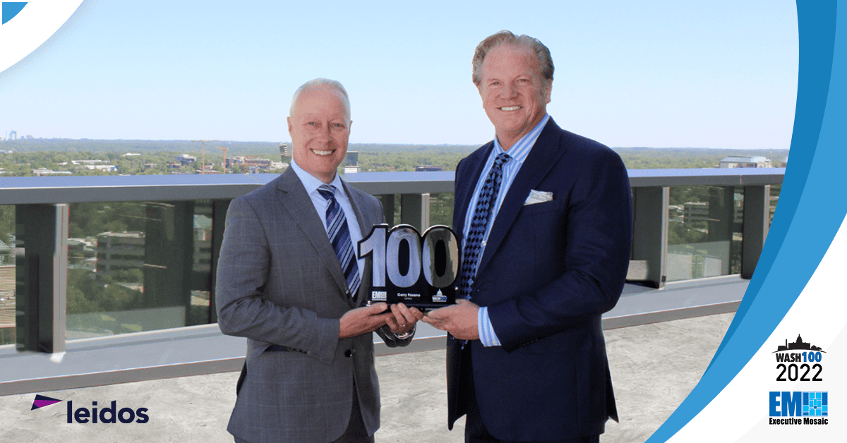 Gerry Fasano, president of the defense group at Leidos, was presented his 2022 Wash100 Award, the third consecutive year that he’s received the honor, by Executive Mosaic CEO Jim Garrettson during a recent visit to the company’s office.
