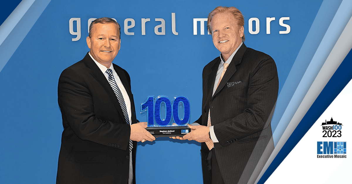 Stephen duMont, president of GM Defense, received his first Wash100 Award from Executive Mosaic CEO Jim Garrettson during a recent visit to GM offices.