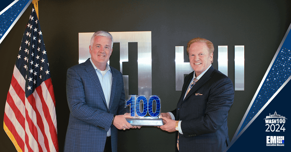 Executive Mosaic CEO Jim Garrettson delivered a 2024 Wash100 Award to Andy Green, an executive vice president of HII and president of the HII Mission Technologies division, during a recent visit to HII.