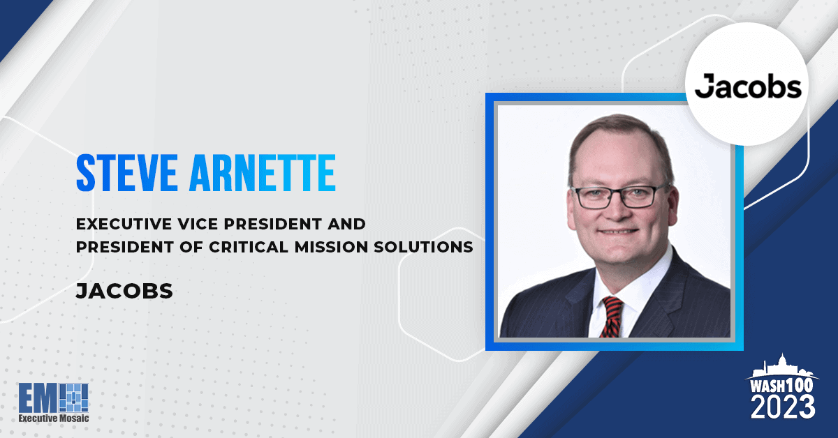 Arnette, the president of Jacob's critical missions solutions business, is among the top government and GovCon leaders inducted by Executive Mosaic into the Wash100 class during its historic 10th-year run. The award recipients exemplify innovation, positive federal landscape impact, proven contributions and achievements as well as vision for the coming year.