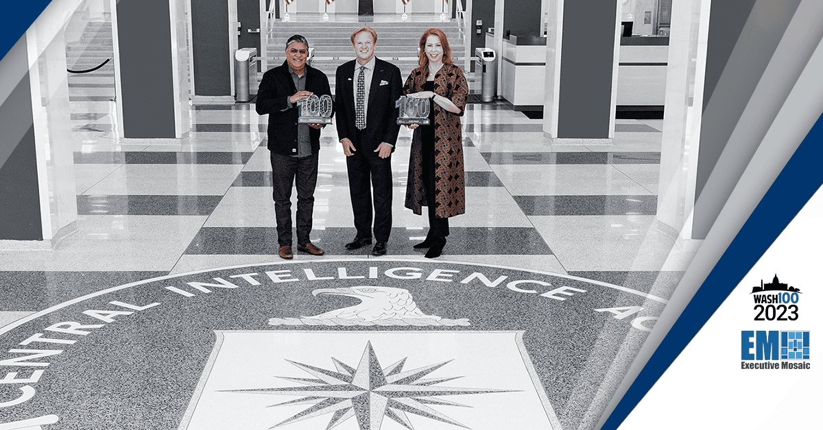2023 Wash100 Award honorees Jennifer Ewbank, CIA's deputy director for digital innovation, and Nand Mulchandani, chief technology officer, were presented with their plaques by Executive Mosaic CEO Jim Garrettson.