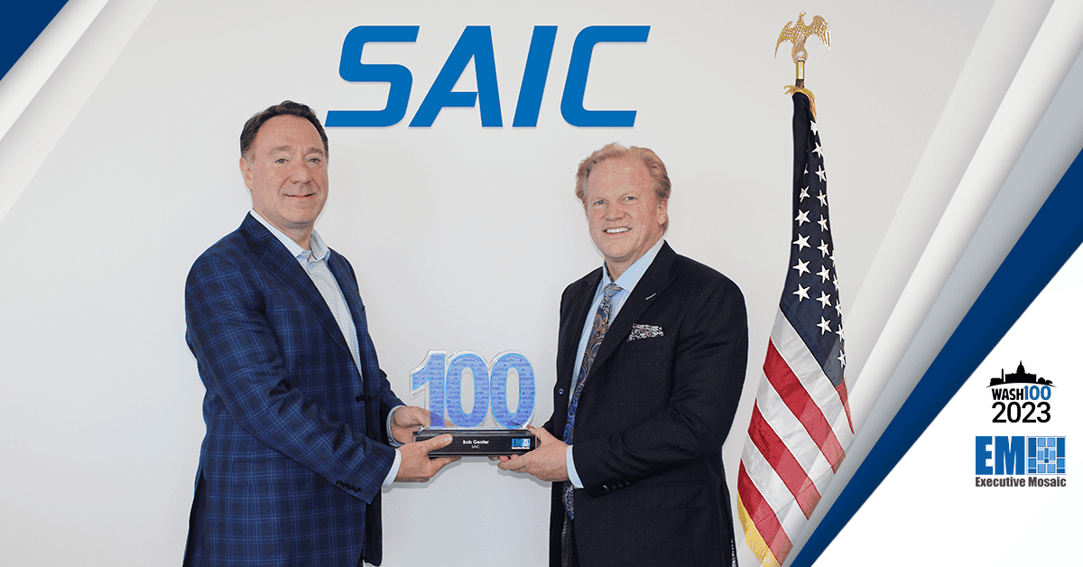 Bob Genter, president of the defense and civilian sector at Science Applications International Corp., received his first-ever Wash100 award during Executive Mosaic CEO Jim Garrettson's recent visit to the SAIC headquarters.