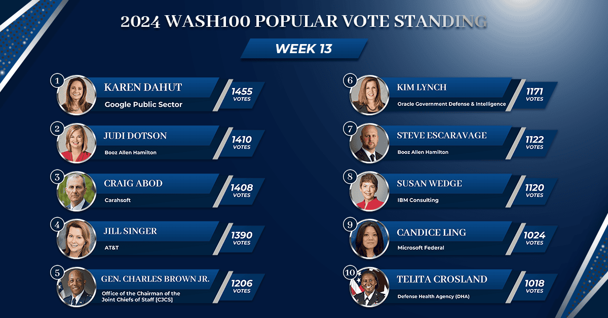 It’s red alert hours here at Executive Mosaic headquarters — less than one week remains in the 2024 Wash100 popular vote contest. When the clock strikes midnight on May 1, you will no longer be able to foist your support behind your favorite executives in government contracting. Then, just a couple of days later, when all of the votes are tabulated, we will have a new popular vote champion! And there’s lots of movement in the list with only days remaining. In fact, we have a new number one as of this writing (Friday, 6:00 a.m. EST). But more on that in a moment…