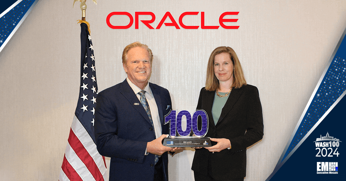 Kim Lynch, executive vice president of government defense and intelligence at Oracle, recently received her 2024 Wash100 Award from Jim Garrettson, CEO of Executive Mosaic and founder of the esteemed accolade.