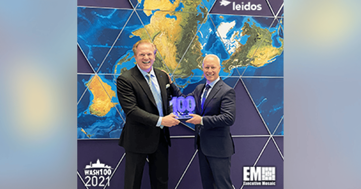 Gerry Fasano, president of Leidos' Defense Group, received his 2021 Wash100 Award from Executive Mosaic CEO Jim Garrettson during a recent visit to Leidos for his leadership and efforts to drive massive defense contracts with federal customers and spearheading valuable acquisitions, which has expanded Leidos revenue and influence in the marketplace.