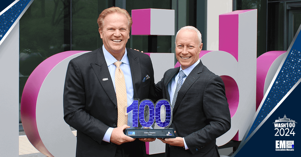 Leidos Chief Growth Officer Gerry Fasano recently accepted his 2024 Wash100 Award from Executive Mosaic CEO Jim Garrettson.