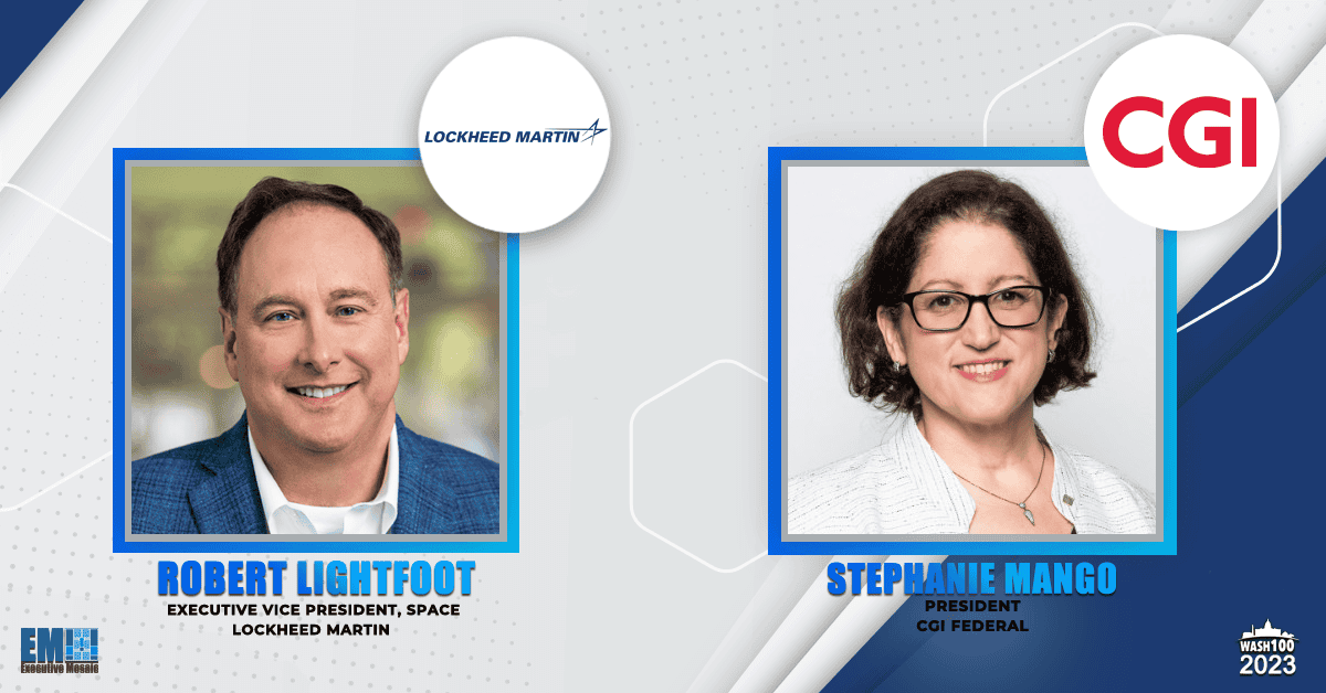 On Thursday, Robert Lightfoot, executive vice president of Lockheed Martin’s space business, and CGI Federal President Stephanie Mango were featured by Executive Mosaic as winners of its 2023 Wash100 Award.