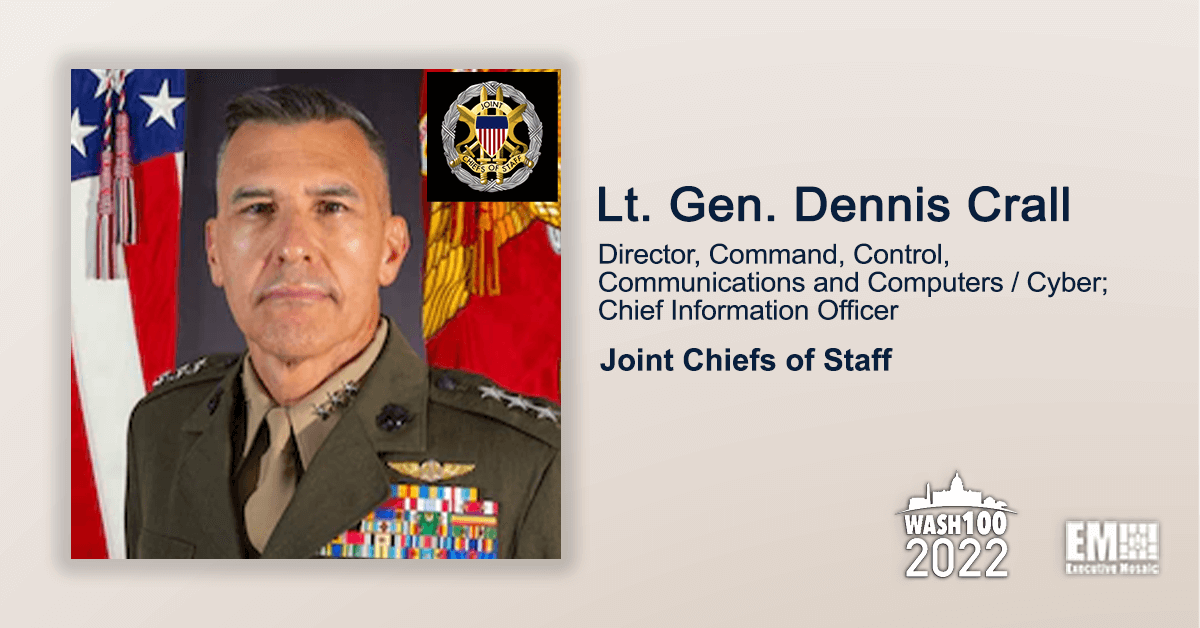 Executive Mosaic is pleased to announce Lt. Gen. Dennis Crall, chief information officer and director of command, control, communications and computers/cyber at the Joint Chiefs of Staff, as a 2022 Wash100 Award inductee for continuing development and implementation of the Joint All Domain Command and Control strategy.
