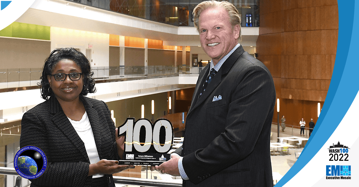 Tonya Wilkerson, deputy director of the National Geospatial-Intelligence Agency (NGA), was presented her 2022 Wash100 Award, the highest honor in government contracting (GovCon), by Executive Mosaic CEO Jim Garrettson on May 3rd during a recent visit to NGA Campus East in Springfield, VA.