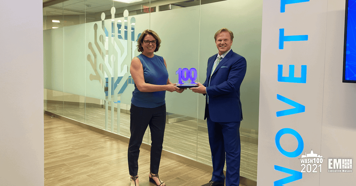 Tiffanny Gates, president and CEO of Novetta, was presented her third Wash100 Award on Monday, the most prestigious honor in all of government contracting (GovCon), during a recent visit to Novetta by Jim Garrettson, CEO of Executive Mosaic and founder of the Wash100 Award.