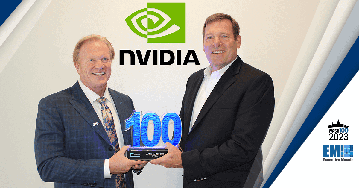 Anthony Robbins, vice president of NVIDIA’s federal business, accepted his sixth Wash100 prize from Jim Garrettson, CEO and founder of Executive Mosaic and the award itself, in a convivial meeting at NVIDIA’s Herndon, Virginia office in July.