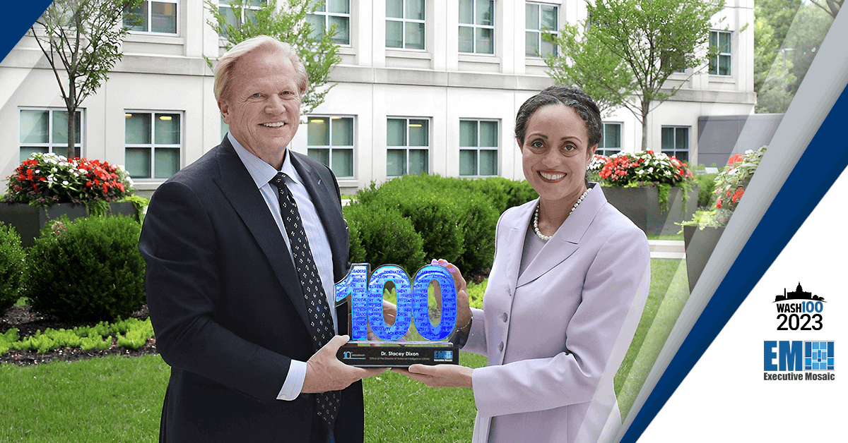 Dr. Stacey Dixon, principal deputy director of national intelligence, was presented with her fourth Wash100 Award during a meeting with Executive Mosaic CEO Jim Garrettson.