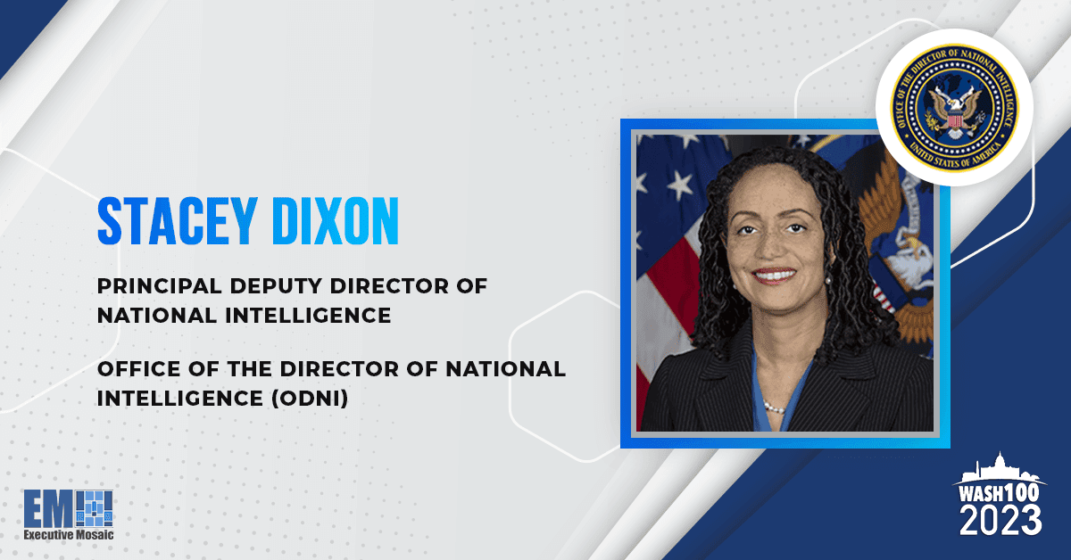 Executive Mosaic is pleased to announce Stacey Dixon, principal deputy director of national intelligence, as a winner of the 2023 Wash100 Award in recognition of her accomplishments in the past year to help ensure and enhance national security. This is the fourth consecutive year Executive Mosaic has selected Dixon to the annual list of leaders that shape the narrative around government contracting and promote collaborative innovation.