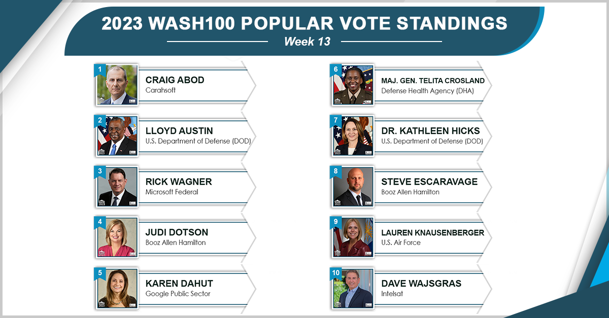 Another Booz Allen executive who also showed tremendous progress this week, entering the top 30 anew at number nine, is Executive Vice President Steve Escaravage. Similarly working her way up the top 10 is last year’s popular vote winner, Department of the Air Force Chief Information Officer Lauren Knausenberger, who ascended two slots in the last week to a placement at number eight.