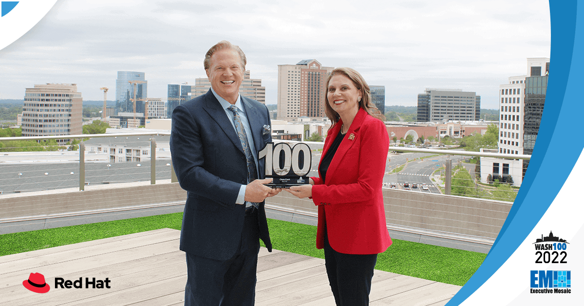 Executive Mosaic CEO Jim Garrettson recently presented the first Wash100 Award, the most acclaimed and prestigious award in all of government contracting (GovCon), to Clara Conti, vice president and general manager of Red Hat Public Sector, during a visit to the company’s office.