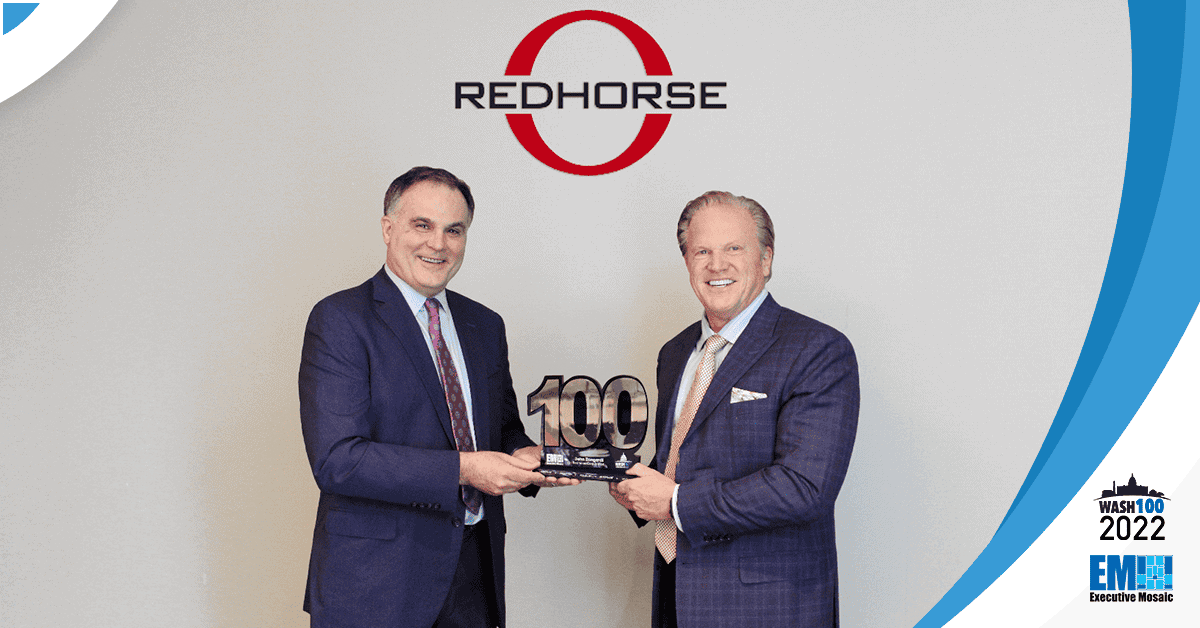 John Zangardi, CEO of the Redhorse Corp. and former chief information officer for the Department of Homeland Security (DHS), was presented his first Wash100 Award during a recent visit to the company’s office in Arlington, VA by Executive Mosaic CEO Jim Garrettson.