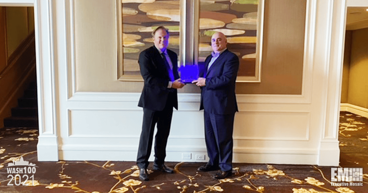 Roy Azevedo, president of Raytheon Intelligence & Space (RI&S) for Raytheon Technologies, was presented his 2021 Wash100 Award during Executive Mosaic's 4×24 dinner on Thursday by Jim Garrettson, CEO of Executive Mosaic and founder of the Wash100 Award