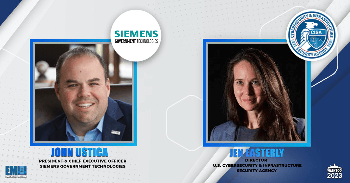 Executive Mosaic congratulated John Ustica, president and CEO of Siemens Government Technologies, and Jen Easterly, director of the Cybersecurity and Infrastructure Security Agency, on Monday for their induction into the Wash100 Class of 2023.