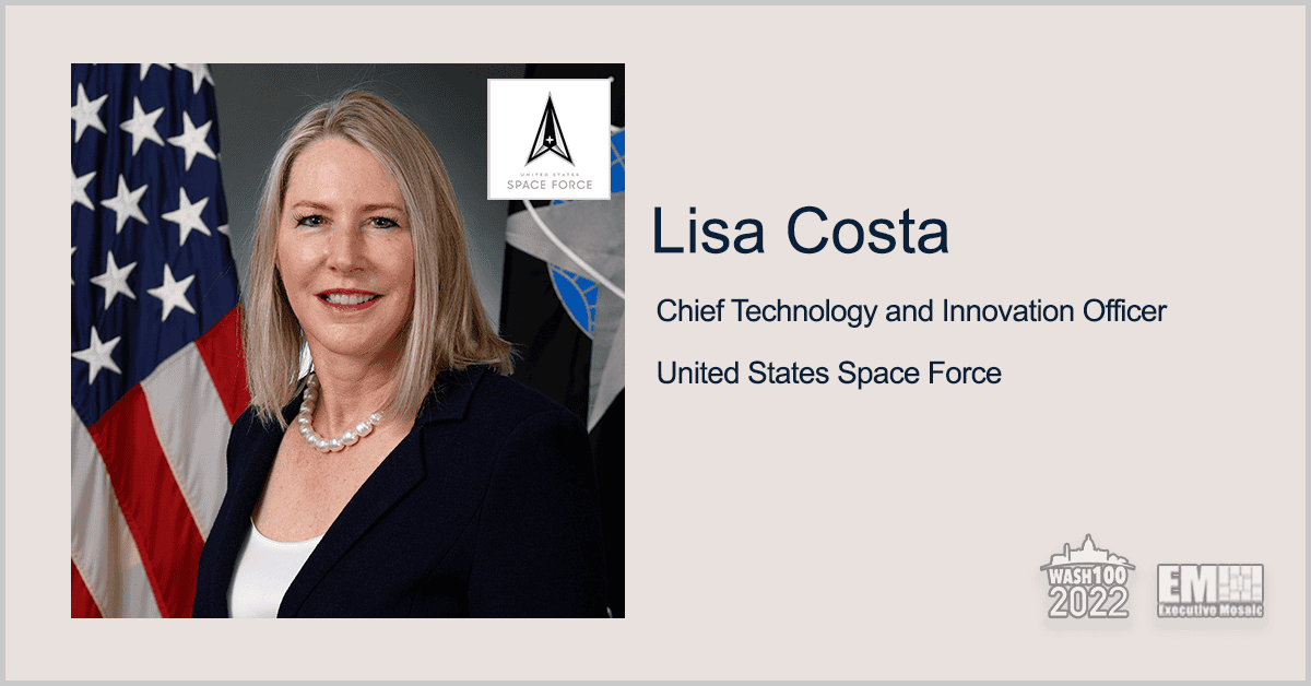 Lisa Costa, chief information and technology officer of the U.S. Space Force, is featured in Executive Mosaic's 2022 Wash100 list for her strategic vision for developing agile service leaders and systems in the digital age.