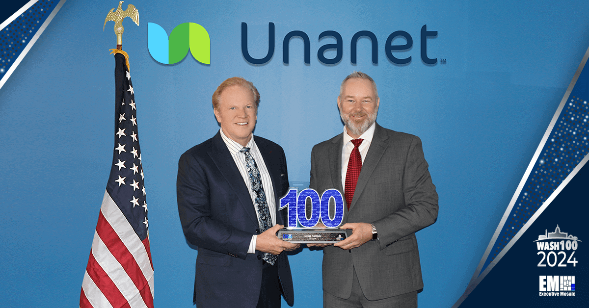 Unanet CEO Craig Halliday was presented with his 2024 Wash100 Award during a meeting with Jim Garrettson, CEO of Executive Mosaic and founder of the accolade, which annually recognizes the 100 most influential and impactful leaders who have contributed to the growth of the federal government marketplace.