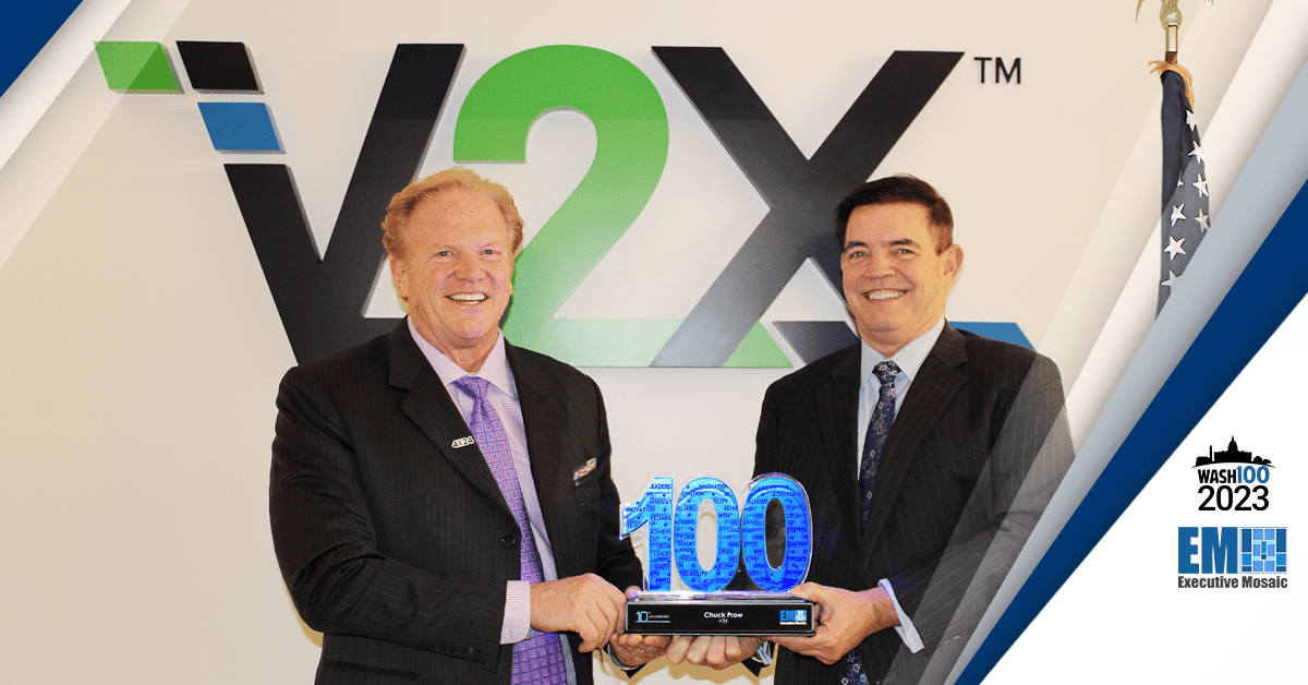 V2X CEO Chuck Prow received Executive Mosaic CEO Jim Garrettson at the defense contractor's headquarters in Tysons, Virginia, and was presented with his Wash100 Award plaque for being listed among the elite of the elite in the government contracting industry. Prow's inclusion in the 2023 Wash100 class marks his ninth time winning the award.