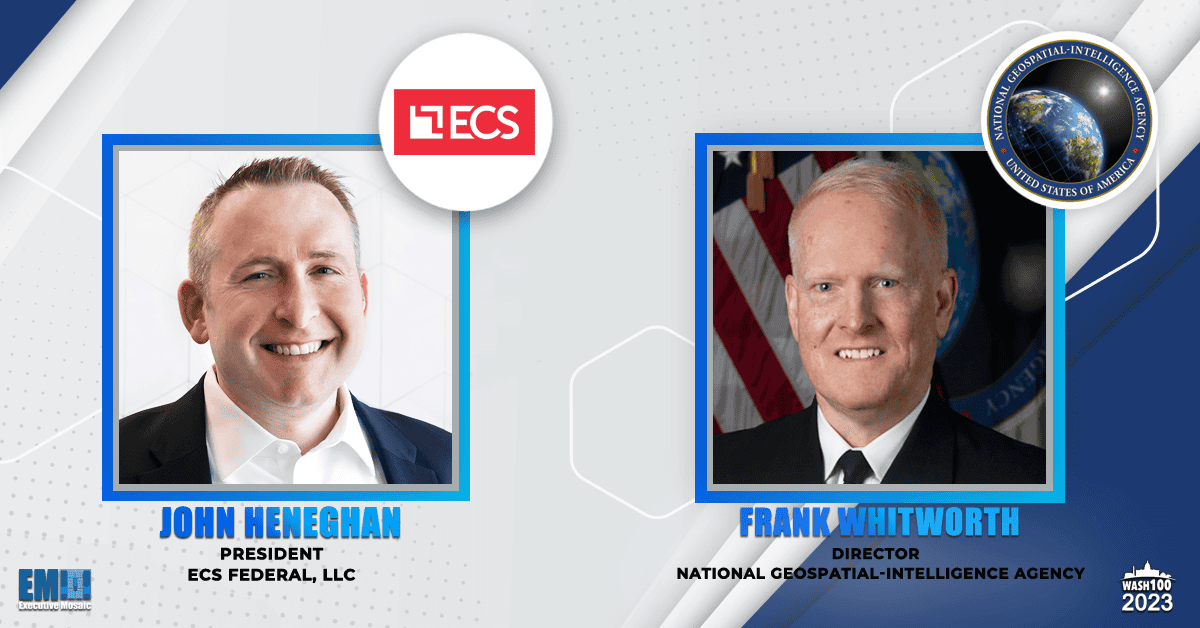 Today, Executive Mosaic publications praised the efforts and careers of 2023 Wash100 Award winners John Heneghan, president of ECS Federal and Vice Admiral Frank Whitworth, director of the National Geospatial-Intelligence Agency. Both are being honored with the Wash100 for the second year in a row.