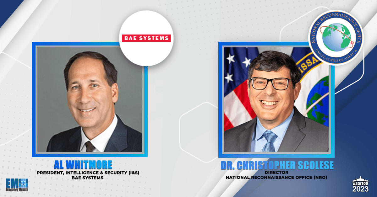 Two leaders at opposite ends of the public-private sector continuum were recognized for their Wash100 Award wins on Wednesday. Executive Mosaic publications singled out the achievements of BAE Systems President of the Intelligence and Security Sector Al Whitmore and National Reconnaissance Office Director Christopher Scolese in a pair of profiles celebrating their 2022 accomplishments.