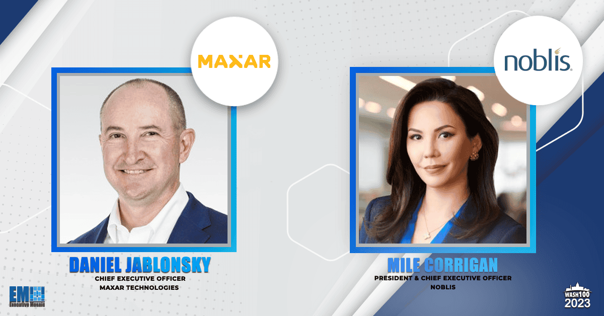 Two top-notch private sector leaders were profiled in Executive Mosaic publications today for their exemplary contributions to the government contracting market. Maxar President and CEO Dan Jablonsky and Noblis President and CEO Mile Corrigan are winners of the 2023 Wash100 Award, GovCon and the federal sector’s foremost honor. EM has compiled the Wash100 annually for the last decade in an effort to gather and celebrate the best and brightest in the government services industry, identifying high achievers of the last year and those poised to topple competition and shine in the year to come.