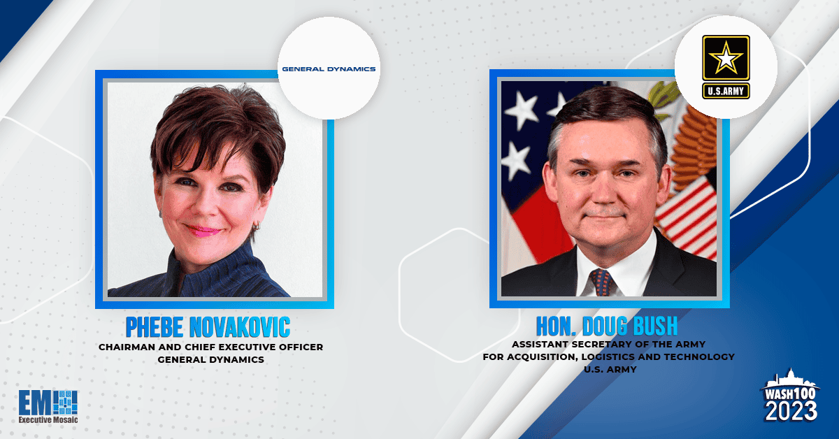 Executive Mosaic brought General Dynamics Chairman and CEO Phebe Novakovic and Douglas Bush, assistant secretary of the U.S. Army for acquisition, logistics and technology, into the spotlight on Monday in recognition of their 2023 Wash100 Awards.