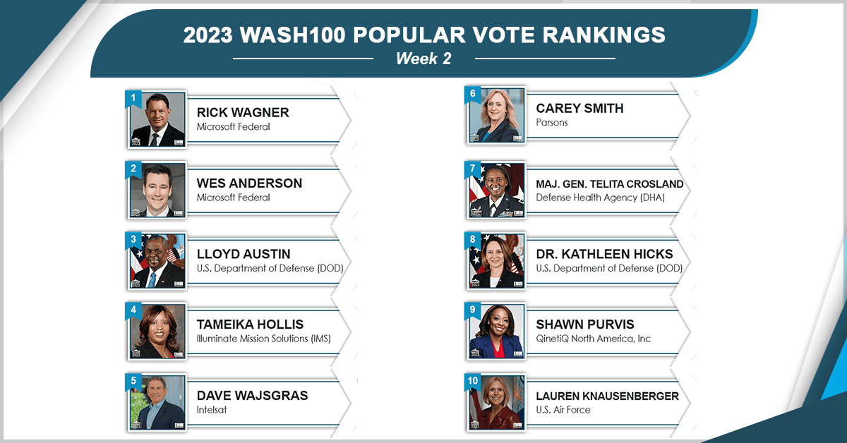 Since last Friday, competition has intensified as new executives gain traction in the top 30 popular vote standings. The top four remains the same: Microsoft Federal’s Rick Wagner and Wes Anderson at numbers one and two, respectively, with Secretary of Defense Lloyd Austin at number three and first-time Wash100 winner Tameika Hollis, CEO of Illuminate Mission Solutions, at number four.